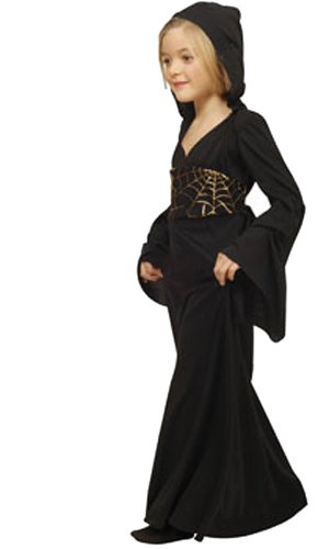 #Déguisement composé d'une très belle robe aux belles finitions rehaussée d'une capuche et imprimée d'une toile d'araignée sur le buste. Déguisement Enfant Gothique idéal pour toutes fêtes déguisées et costumées dans le cadre d'Halloween, mais aussi pour carnaval et goûters d'enfants.